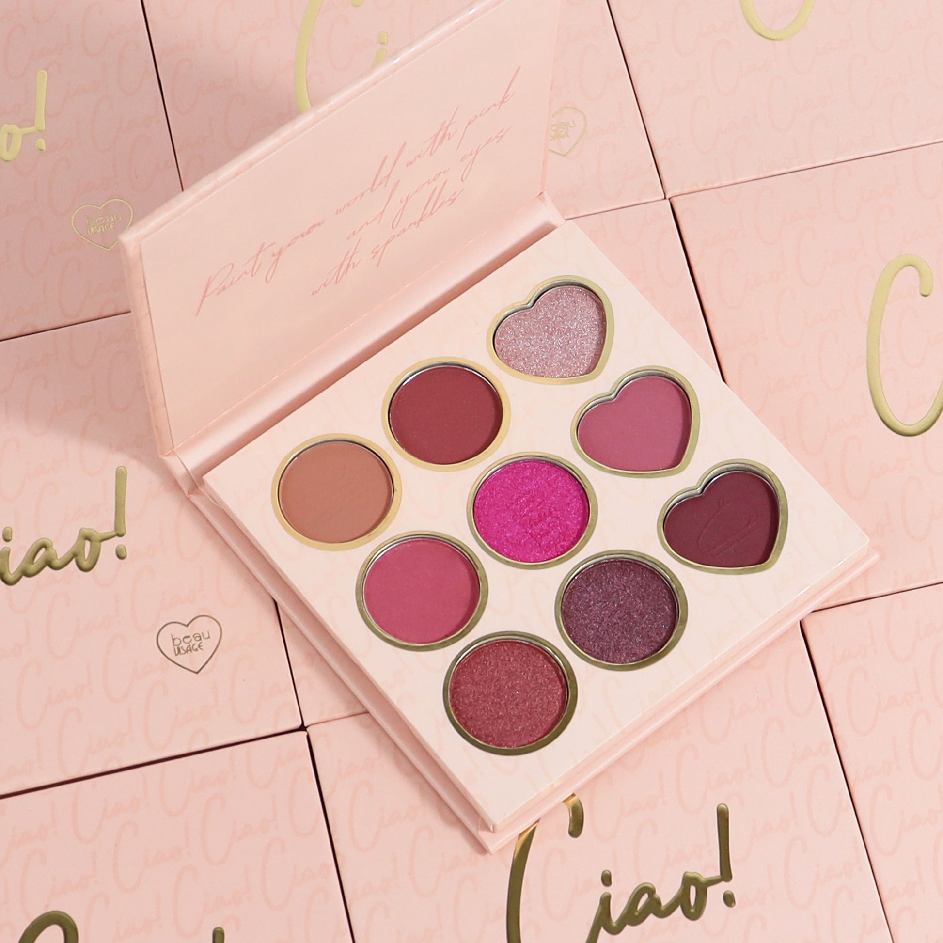 Ciao es nuestra paleta de 9 cautivadores tonos con diferentes acabados, desde un fucsia intenso hasta suaves tonos rosas claros y la profundidad de misteriosos tonos vino. Ya sea que desees un look mate, un brillo sutil o un acabado satinado, esta paleta lo tiene todo. Su fórmula de alta calidad está altamente pigmentada y se difumina a la perfección, lo que te permite crear looks suaves y naturales.